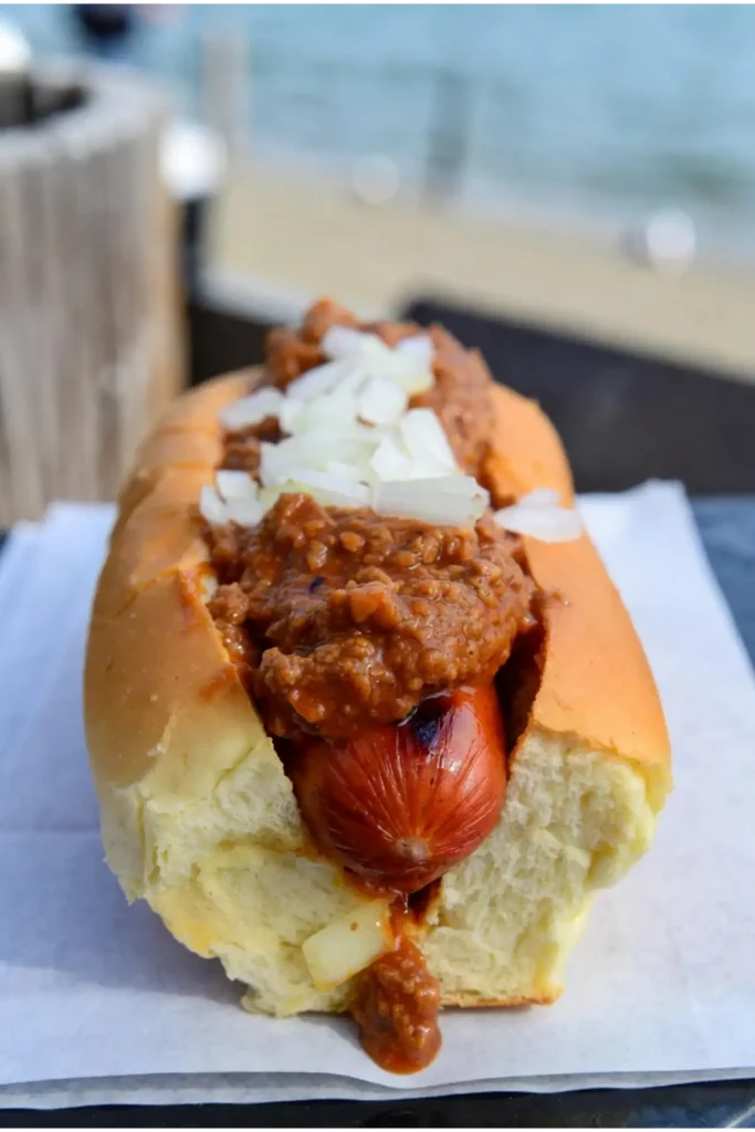 The classic North Carolina hot dog, also known as the Carolina Slaw Dog, is the undisputed soul food king of the southern states: a steamed bun, grilled all-beef red sausage (Jesse Jones or Bright Leaf), mild tomato-based chili sauce without beans, raw onion cubes, spicy yellow mustard, and – the absolute trademark – a thick helping of homemade vinegar-based coleslaw made from fine cabbage, apple cider vinegar, sugar, mayo, and celery seeds; ketchup is strictly forbidden!