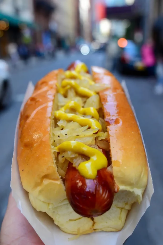 The classic New York hot dog is the indestructible street king of the Big Apple – invented in the 1870s by German immigrants such as Charles Feltman on Coney Island and made a global star by Nathan’s Famous in 1916: A simple, steam-cooked bun encloses a pure all-beef sausage with a natural casing (Sabrett or Nathan’s only!), which is only boiled in hot water and never grilled – topped with a choice of spicy brown mustard sauce, tender onions in tomato sauce (“onions in sauce”), crisp sauerkraut, or neon-red sweet relish. Ketchup is only for tourists; real New Yorkers order “one with everything” and eat it out of their hands as they rush through Manhattan!