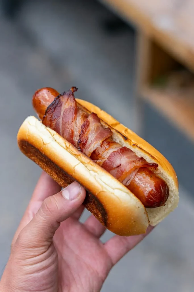 The traditional Texas Tommy hot dog is the fat, cheesy rebel among American hot dogs – born in the 1950s in Philly and South Jersey, where workers needed something hearty that would keep them full longer than a normal dog: A deep-cut hot dog roll is wrapped around a generous slice of thick, smoked bacon, then a crispy all-beef sausage (usually from Dietz & Watson or Sabrett) is added, the whole thing is fried or grilled until the bacon is crispy, and finally melted Cheez Whiz (yes, the classic neon orange kind!) poured thickly over the top – a few dashes of hot mustard or relish are optional, but ketchup? That would be as out of place as a cowboy hat in Manhattan!