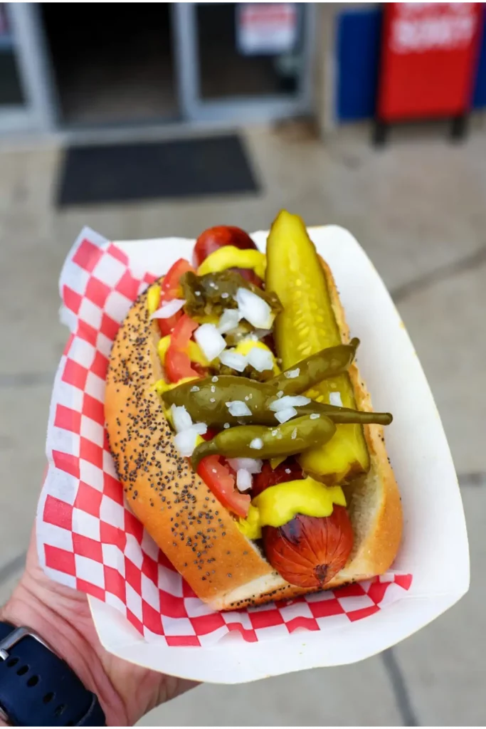 The classic Chicago hot dog is the outrageous pop art star among American hot dogs – a “dragged through the garden” masterpiece that has been satisfying and delighting Depression-era workers since the 1920s: steam-cooked poppy seed bun (preferably from Rosen’s or S. Rosen’s), pure all-beef sausage with natural casing (Vienna Beef only!), which is NEVER grilled, but only boiled in hot water – topped with an explosive garden of bright green sweet relish, fresh tomato slices, crisp dill pickle spears, fiery sport peppers, raw onion cubes, a generous stripe of yellow mustard, and a dash of celery salt; ketchup is absolutely taboo!